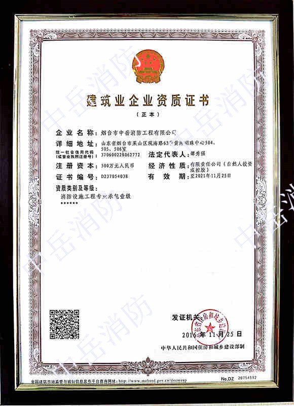 2016年11月25日我公司順利通過(guò)了山東省住房和城鄉(xiāng)建設(shè)廳的審核,晉升為消防設(shè)施工程專業(yè)承包壹級(jí)資質(zhì)!